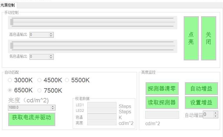 系統(tǒng)軟件界面如下圖。軟件界面比較直觀,可以手動調(diào)節(jié) LED 的電流大小,在界面上就是光標的位置,越往右代表電流越高,亮度越高。