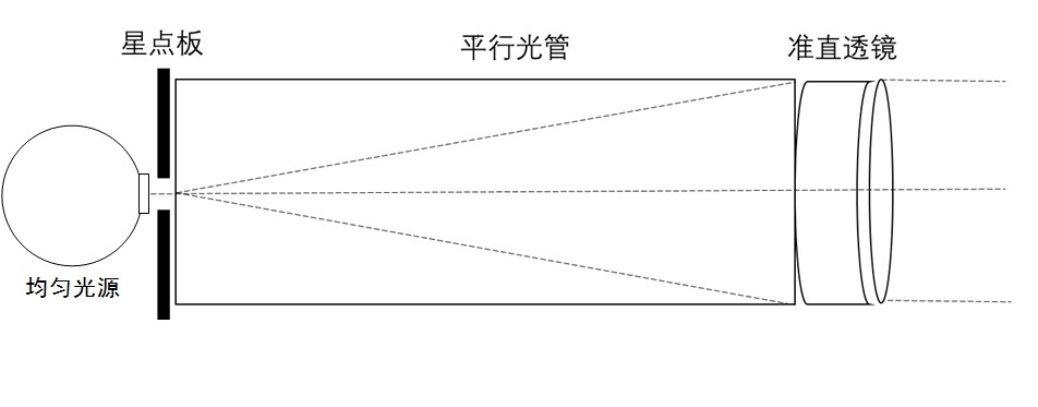 均勻光源經(jīng)過星點板后,再由平行光管準直出射光,在30m遠處形成直徑80mm的光斑,光斑亮度滿足-1~7等星的亮度要求,平行光管將光線準直,發(fā)散角小于 0.003°,出射光亮度通過調(diào)節(jié)光源電流進行控制。